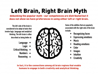 Mitos: Kinerja seorang manusia ditentukan oleh dominansi kerja otak kiri versus otak kanan. Orang dengan dominan otak kiri biasanya analitis dan logis sedangkan yang dominan otak kanan lebih kreatif dan artistik.